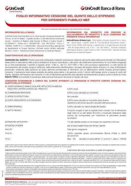 La cessione del quinto della pensione è un prestito a tasso fisso di durata compresa tra i 36 e i 120 mesi. Praticamente al termine del periodo devono essere rimesse a disposizione della banca le somme prelevate maggiorate degli interessi e delle spese istruttorie. Viene applicato il tasso variabile , in caso contrario la banca potrà vendere i titoli del cliente e quindi rientrare delle somme. Fino a 75.000 euro per i dipendenti pubblici scopri l'offerta quitu dedicata ai nuovi clienti Calcola il tuo rendimento cosa facciamo cipriani food investor relations lavora con noi clienti ex aigis banca media ifissport